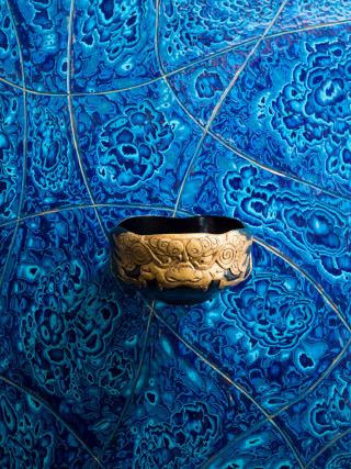 漆で青を使った作品は実は20~30年前からありました。三橋鎌幽自身は邪道だと思っていましたが、フランスの教会での経験を経て、青い作品がつくりたいと思い始めたのでした。2018年に金箔とロイヤルブルーの組み合わせで作品を発表したところ、思いがけず評判がよく、青が入ることで、今まで鎌倉彫に興味がなかった人たちにも手にとってもらえたということもありました。そればかりか、青い作品をとおして、既存の赤や黒の作品が息を吹き返した実感もありました。