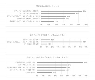 写真整理の現状については、自分が子供の頃の写真については43%の人が「ほぼ整理できている」と回答。親が作ってくれたアルバムがあるからと推測されます。一方で自分の家族写真については「ほぼ整理できている」と回答したのは29%。「整理の途中」という人が最も多く38%、「いつか整理するつもり」の人が22%、「整理したいができそうもない」という人も10%いました。