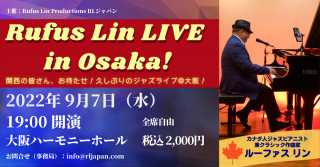 大人気カナダ人ジャズピアニストルーファスリンによる、9年ぶりの関西公演「Rufus Lin LIVE in Osaka!」のチケットが好評発売中です。