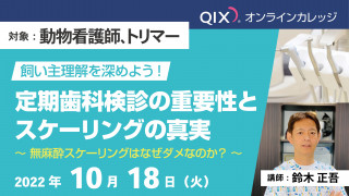 株式会社QIX(所在地:東京都町田市、代表取締役社長:生田目康道)は、QIXオンラインカレッジ『飼い主理解を深めよう!定期歯科検診の重要性とスケーリングの真実~無麻酔スケーリングはなぜダメなのか~』を開催いたします。