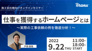 BRANU株式会社(本社:東京都港区 / 代表:名富 達哉 以下 ブラニュー)は、建設中小企業を対象に、仕事獲得をテーマとしたオンラインセミナー「仕事を獲得するホームページとは?~実際の工事依頼の例を徹底分析!~」を、2022年9月22日 に開催します。