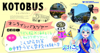 香川県の”つるキャラ”「うどん脳F」(ふうちゃん)と、コトバス所属VTuber(バーチャルYouTuber)の「海杜こと」が、オンラインバスツアーで香川県琴平町を案内します。こんぴら表参道や旧金毘羅大芝居「金丸座」の見学、中野うどん学校でうどん脳Fによるうどん手打ちチャレンジなど。ツアー実施日は2022年9月25日(日) 。
