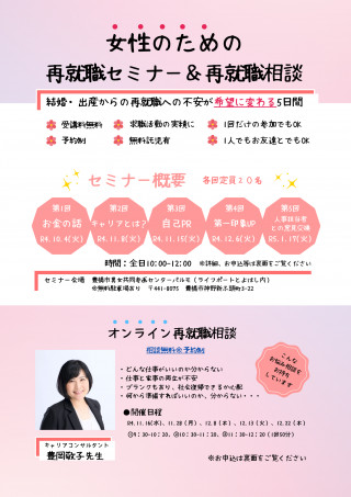 自分らしく働きたい、毎日を変えたい。でもブランクが長いなどの理由で迷ってしまうという30~50代の女性に!結婚・出産・育児などで離職したけれど「もう一度働きたい」という女性を支援する「再就職セミナー&オンライン再就職相談」を愛知県豊橋市で実施します。