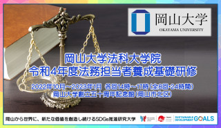 今回、岡山大学法科大学院では、「令和4年度法務担当者養成基礎研修」を2022年10月 ~2023年1月 までの期間に全8回の日程で、本学津島キャンパスの岡山大学創立五十周年記念館(岡山市北区)で開催します。