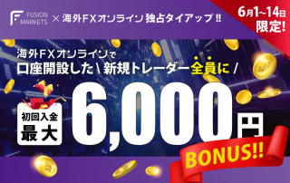 海外FXの総合比較サイト『海外FXオンライン』では、Fusion Marketsとのタイアップ企画として「入金ボーナス ¥6,000 獲得キャンペーン!」を実施中です。