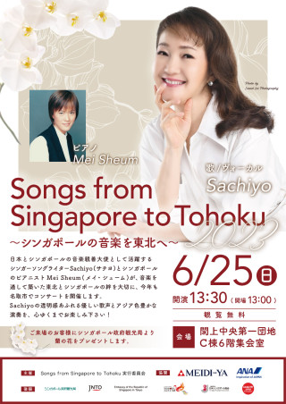 Songs from Singapore to Tohoku 実行委員会は、東日本大震災復興支援コンサート「Songs from Singapore to Tohoku 2023」を、宮城県名取市閖上にて2023年6月25日(日) に開催することを発表いたします。