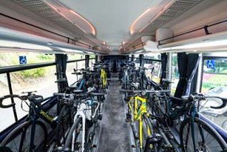 車内中央部に自転車の配置スペースが設けられ、最大12台まで車体をそのまま固定できます。またトランクには車輪を外して8台が収納できるため、合計で最大20台までの収納が可能。電動リフトを備えるためEバイク(電動アシスト自転車)など重量がある自転車も簡単に搭載できます。