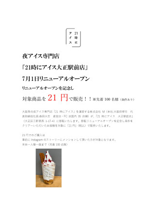 大阪発の夜アイス専門店「21時にアイス」を運営する株式会社M(本社:大阪府堺市 代表取締役社長:森田大志 直営店・FC店国内35店舗)が、「21時にアイス 大正駅前店」(大正区三軒家西1-17-4)に移転いたします。移転リニューアルオープンを記念し条件をクリアーいただいたお客様を対象に「21円」(税込)で販売いたします。