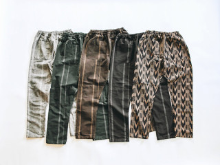 福岡県南部・筑後市にある、久留米絣・筑紫つむぎの織元「株式会社 久保かすり織物」の生地を使用。ここは、厳選した糸と緻密な柄合わせによって洗練された印象が生まれる「板絣(いたがすり)」に特化しており、心地よい肌ざわりと涼感が特徴の「筑紫つむぎ」を行う唯一の織元でもあります。オリジナルもんぺ製作にあたり、こちらの工房に通い、2種類の柄を選び抜きました。また、定番の現代風もんぺにはフロントポケットが1つついていますが、今回のオリジナルでは、使い勝手を考え、ダブルポケットにアレンジしました。
