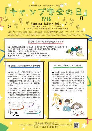 公益社団法人日本キャンプ協会ではより安全に楽しくキャンプを実施してもらうため、毎年7月の第3日曜日を「キャンプ安全の日」と定め、全国の47都道府県キャンプ協会と共同で「キャンプ安全の日」全国一斉キャンペーンを実施しています。