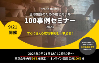 温浴施設の経営コンサルティングを手掛ける株式会社アクトパス(東京都中央区銀座3-11-5第2中山ビル7F 代表取締役 望月義尚)は、2023年9月21日(木) にサウナ・温泉・スーパー銭湯など温浴施設の経営・運営者を対象とした「温浴施設のための成功モデル100事例セミナー2023」を開催いたします。