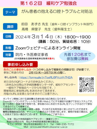 第162回緩和ケア勉強会を2024年3月14日(木) 18:00~19:00に「がん患者の抱える口腔トラブルと対処法」と題して、オンラインで開催します。