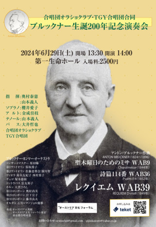 東京都内を中心に活動する、合唱団オラショクラブとTGY合唱団は合同で、来る2024年6月29日 に、ブルックナー生誕200年記念演奏会を、東京晴海の第一生命ホールにて開催いたします。