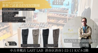 渋谷キャットストリートにある中古革靴・古着をメインに販売するラストラボにて2024年10月26日(土) ・27(日)にメンズトータルファッションブランド「MOVER GARMENTS」の竹田智聡氏をお招きして新作トラウザーご試着会を開催します。
