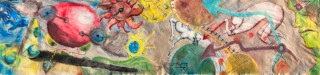 約1㍍×5㍍の巨大な布に、手形コレクターとして知られる清古尊(せいこたける)と、漫画と絵画を融合させた藤井悠輔(ふじいゆうすけ)が絵を描いた。藤井悠輔がテーマを「時間」と定め、原画を制作した後、2人が共同で制作にあたった。