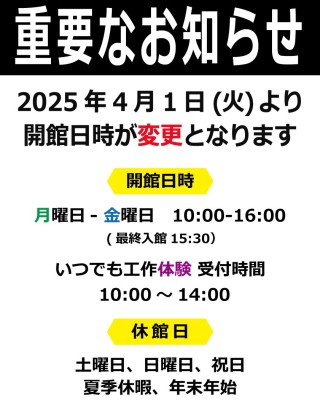 これに伴い、当日予約なしで行える「いつでも工作体験」の受付時間は10:00~14:00に変更となります。