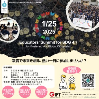 グローバル・シチズンシップ育成事業を手掛ける一般社団法人グローバル教育推進プロジェクト(GiFT)(東京都港区、代表:辰野まどか)は、持続可能な開発目標(Sustainable Development Goals:SDGs)に向かう志を育む場として、2025年1月25日(土) に、聖心グローバルプラザ(渋谷区広尾)にて教育イベント「Educators’ Summit for SDG4.7 – for Fostering our Global Citizenship –」を開催いたします。