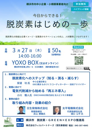 そんな市内の中小企業・小規模事業者の皆様へ向けたセミナーです。本セミナーでは、脱炭素の基本をわかりやすく解説し、中小企業・小規模事業者が無理なく取り組める具体的なステップをご紹介します。また、既に脱炭素化を進めている市内中小企業2社が登壇し、具体的な取組内容や脱炭素化の効果について紹介します。