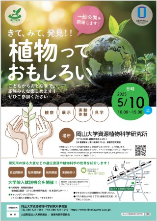 国立大学法人岡山大学(本部:岡山市北区、学長:那須保友)の高等先鋭研究院を構成する研究所のひとつである資源植物科学研究所(岡山県倉敷市)では、「令和7年度 岡山大学資源植物科学研究所一般公開 きて、みて、発見!!植物っておもしろい!」を、2025年5月10日(土) 10:00〜15:00に開催します。