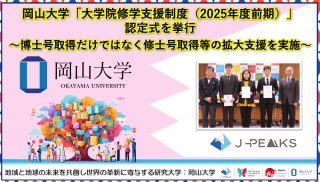 国立大学法人岡山大学(本部:岡山市北区、学長:那須保友)は2025年3月27日 、2024年度から実施している岡山大学「大学院修学支援制度」の2025年度前期認定式を、本学津島キャンパスの本部棟で挙行しました。