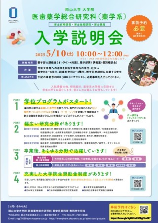 国立大学法人岡山大学(本部:岡山市北区、学長:那須保友)の大学院医歯薬学総合研究科(薬学系)は、今後大学院への進学を目指す学内外の学生に、医歯薬学総合研究科(薬学系)の教育、研究プログラムを広く周知することを目的として、入学説明会を2025年5月10日(土) 10:00〜12:00に開催します。