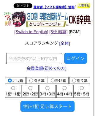 個人開発者 岡島正尚は、本日2025年5月3日 、早解き暗算で高レベル/高得点を目指すゲーム『クリプト暗算』をWEBブラウザで配信開始したことをお知らせします。
