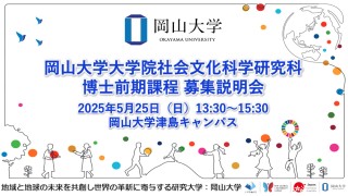 国立大学法人岡山大学(本部:岡山市北区、学長:那須保友)の大学院社会文化科学研究科では、2025年5月25日(日) 13:30~15:30に「博士前期課程募集説明会」を、本学津島キャンパス文化科学系総合研究棟2階共同研究室で開催します。
