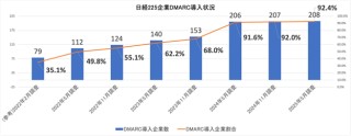 日経225企業は、全225社の内208社(92.4%)が少なくとも一つのドメインでDMARCを導入しており、昨年同月と比較すると1年間で0.8ポイントの増加にとどまっています(図1)。