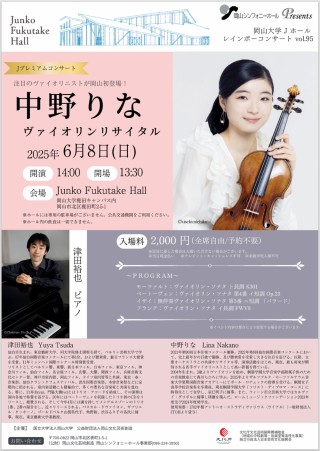 国立大学法人岡山大学(本部:岡山市北区、学長:那須保友)では、 2025年6月8日(日) に本学鹿田キャンパスの岡山大学Junko Fukutake Hall(Jホール)にて、レインボーコンサートvol.95 Jプレミアムコンサート『中野りな ヴァイオリンリサイタル』 を開催します。