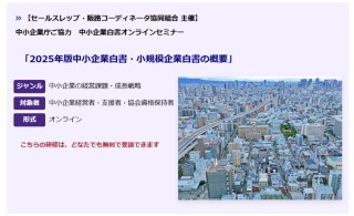 日本販路コーディネータ協会(東京都北区赤羽西1-22-15:代表 小塩稲之)は昨年好評を博した「中小企業白書・小規模企業白書説明会」を今年も開催します。本セミナーでは、2025年版白書の最新分析をもとに、令和6年度の中小企業・小規模事業者の動向と課題への対応策をわかりやすく解説。M&A、イノベーション、海外展開などの成長戦略や、実際の成功事例を交えた具体的な取り組みを紹介します。経営改善や事業成長を目指すすべてのビジネスパーソンにとって、実践的なヒントが詰まった内容です。