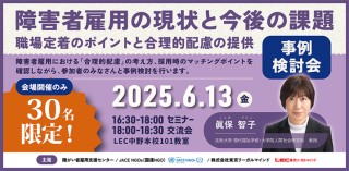 各種資格・国家試験の総合スクール株式会社東京リーガルマインド(代表者:反町 雄彦、本社:東京都千代田区、以下LEC)は、6月13日(金) に無料セミナー「【障害者雇用支援 無料セミナー&交流会】障害者雇用の現状と今後の課題 職場定着のポイントと合理的配慮の提供~事例検討会~」を開催します。