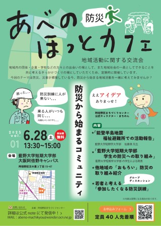 阿倍野区まちづくりセンター(大阪市阿倍野区)は、地域交流イベントとして、防災をテーマにした「あべの防災ほっとカフェ」を2025年6月28日(土) に開催いたします。