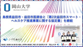 岡山大学と島根県益田市は、同市の健康課題である脳卒中の発症を予防する観点から、スマート・ヘルスケア推進事業に関する連携協定を令和2年に締結。市民がデジタル家庭用血圧計を用い血圧管理を行ったデータを、本学学術研究院医歯薬学域の神田秀幸教授(公衆衛生学)が解析、研究を実施しています。このたび、長期的かつ継続的なデータの収集を促すため、公益社団法人益田市医師会を迎え、3者が連携していくことで合意しました。