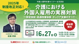各種資格・国家試験の総合スクール株式会社東京リーガルマインド(代表者:反町 雄彦、本社:東京都千代田区、以下LEC)は、6月27日(金) に無料セミナー「【外国人雇用支援 無料セミナー&交流会】2025年制度改正対応!介護における外国人雇用の実務対策~特定技能・処遇改善加算・キャリア支援のすべて~」を開催します。