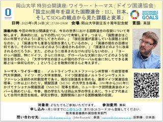 国立大学法人岡山大学(本部:岡山市北区、学長:那須保友)は、2025年6月24日(火) 17:30~19:00に特別公開講座 ワイラー・トーマス講演「設立80周年を迎えた国際連合:EU、日本、そしてSDGsの観点から見た課題と変革」を、本学津島キャンパスの岡山大学創立五十周年記念館で開催します。
