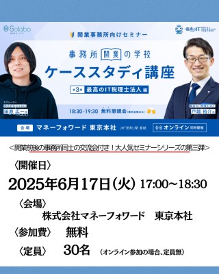 マネーフォワードが開催する、「事務所開業の学校 (ケーススタディ講座) Vol.3」では「IT×補助金×税務会計=経営革新」を掲げ、開業後2年半でスタッフ42名・クライアント500件まで急拡大を実現した最高のIT税理士法人の戸越裕介氏をお招きし、開業前の戦略設計や、資金調達の方法・使い道、営業・マーケティング手法など開業時のエピソードやノウハウをご紹介いたします。