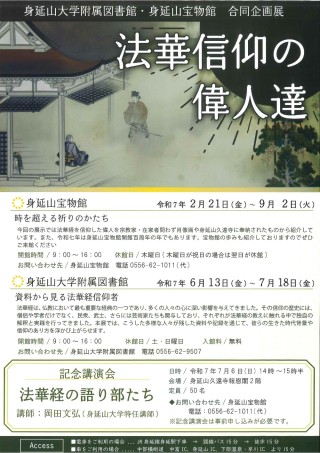 身延山大学附属図書館(山梨県南巨摩郡身延町身延3567 館長:伊東久実)と身延山宝物館では、平成14年(2002年)より合同企画展を開催しています。 令和7年度は「法華経信仰の偉人達」の共通テーマのもと、大学附属図書館では「資料から見る法華経信仰者」と題して、普段は貴重本書庫にて管理・保存している貴重資料の公開をいたします。