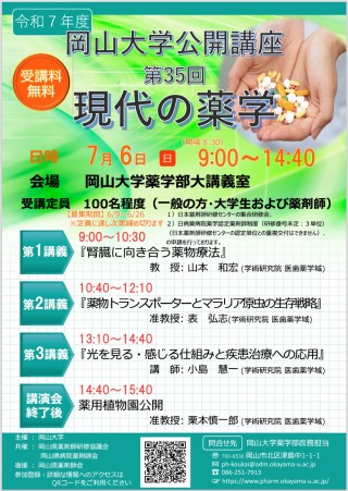 国立大学法人岡山大学(本部:岡山市北区、学長:那須保友)の薬学部では、2025年7月6日(日) 9:00~14:00に、令和7年度岡山大学公開講座「現代の薬学(第35回)」を開催します。
