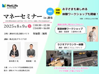 調布エフエム放送株式会社(所在地:東京都調布市、代表:南 孝二)は、メットライフ生命保険株式会社が主催するマネーセミナー『子育て世代のあなたにおすすめ!マネーセミナーin調布』を8月9日 に調布市文化会館たづくりで行います。