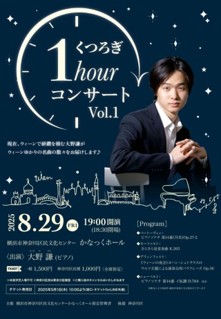 2025年度より[かなっくホールクリエイティブパートナー]を務め、現在ウィーンで研鑽を積む若手ピアニスト大野謙氏がウィーンゆかりの名曲の数々をお届けします。お仕事終わりに鑑賞しやすい、夜公演(19:00開演)を企画いたしました。1日の疲れを癒すピアノの素敵な演奏をホールでご鑑賞ください。