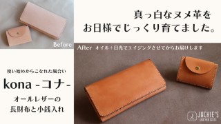 この度、革の汚れや日焼けが心配で革製品を使えないという方に向けて、ヌメ革をあえて日焼け(エイジング)させることで、使い始めを気負わない革財布を開発致しました。