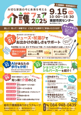 株式会社QOLサービス(福山市)は、2025年9月15日 に東部市民センターにて「家族の今と未来を考える-介護フェア-」を開催します。少子高齢化に伴い、特に介護の「予備世代」へ制度や支援情報の提供が急務となる中、相談・体験・情報発信の場として企画しました。介護保険や地域包括ケアの理解促進を図り、家族だけで支える限界を超えた地域共助の仕組みづくりを目指します。最新の福祉用具展示やケアマネジャーによる介護相談、認知症カフェ、地域支援団体の紹介など、多彩なプログラムを通じて、参加者が介護への理解を深め、地域で支え合う共助の仕組みづくりを促進します。介護を「個人の問題」から「社会全体の課題」へと捉え直すきっかけとなり、地域社会の連携強化と福祉啓発に寄与する重要なイベントです。