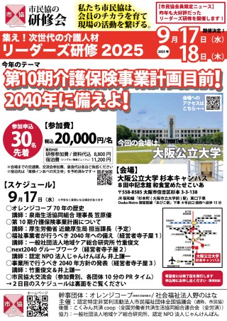 介護系事業者900団体の会員を有し、身近な地域での助け合い・支え合い、優しい福祉のある地域社会づくりを推進している認定特定非営利活動法人市民福祉団体全国協議会(本社:東京都新宿区、代表理事:鷲尾公子・とよしま亮介、略称市民協)は、会員のチカラを育て、現場の活動を繋げるため、2025年9月17日 から18日にかけて、リーダーズ研修2025in大阪「第10期介護保険事業計画目前!2040年に備えよ!」を開催します。