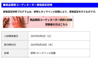 日本商品士会の資格認定制度で、日本商品開発士会の教材に基づいた試験が毎年6月、11月の年2回開催され、合格者はその後の口述試験、論文審査を経て、「商品開発コーディネーター」の資格が認定されます。受験には商品開発士の資格が必要です。次回の資格認定試験は2025年11月9日(日) 、受験受付締切日は2025年10月23日(木) 。