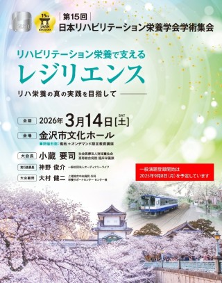 この度、第15回日本リハビリテーション栄養学会学術集会を、令和8年(2026年)3月14日 、石川県の金沢市文化ホールにて開催させて頂きます。