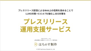 SEO記事作成やオウンドメディア運営全般のサービスを中心としたWebコンテンツ制作サービスを提供している株式会社はちのす制作(本社:東京都、以下「はちのす制作」)は、プレスリリース配信によるWeb上の信用を高めることでLLMO対策とE-E-A-Tを強化しSEO対策にもつながる「プレスリリース運用支援サービス( https://hachinosu-seisaku.co.jp/press-release/ )」を2025年8月8日 に公開いたしました。