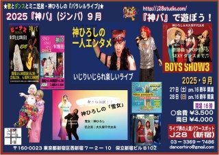 盛り沢山の9月「神パ」は、神ひろしの新たな女性キャラクター「雪女」をはじめ、大久保千代太夫との「BOYS SHOW」第三弾など、刺激的で情熱溢れる夢の競演となるでしょう。
