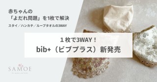 忙しい育児の現場で役立つ“3役1枚”の『bib+(ビブプラス)』は、スタイ/ハンカチ/ループタオルの3WAYで使える24cm角の布製アイテム。