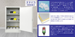 エナバコは、鋼板と石膏ボードを用いた筐体構造と、ロックウールによる断熱扉を採用した耐火保管庫で、主にドローンや電動工具用バッテリーの発熱・発火による延焼リスクを低減させることを目的としています。