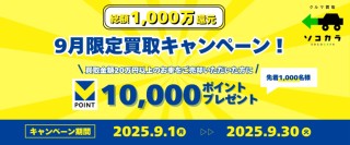 クルマ買取販売ソコカラ〈運営会社:株式会社はなまる〉(本社:大阪府大阪市住之江区/代表:岡崎和也)は、2025年9月1日(月) ~2025年9月30日(火) の期間中、買取金額20万円以上のお車をご売却いただいた方に先着で1,000名様に10,000円相当のVポイントをプレゼントする「総額1000万還元!9月限定買取キャンペーン」を実施いたします。「ソコカラに売ってよかった」とご満足いただけるよう、お客様一人ひとりに寄り添ったサービス提供に努めてまいります。